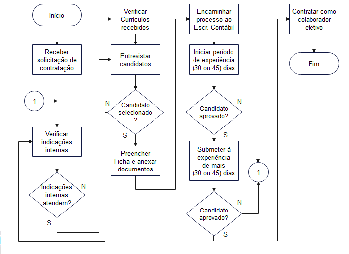 O Processo de Recrutamento e Seleção tem início quando a Área de Recursos Humanos recebe uma solicitação de contratação e informações do perfil solicitado. Essa solicitação deverá ser feita através de e-mail pela área necessitada. A solicitação também pode ser feita verbalmente nas reuniões de rotina, mas para produzir efeitos, deverá ser formalizada por e-mail posteriormente. Após a solicitação, deve-se verificar as indicações internas para contratação. Caso não haja indicações, deverão ser verificados os Currículos recebidos. Em ambos os casos, havendo potenciais candidatos, estes deverão passar por uma entrevista inicial com o RH.